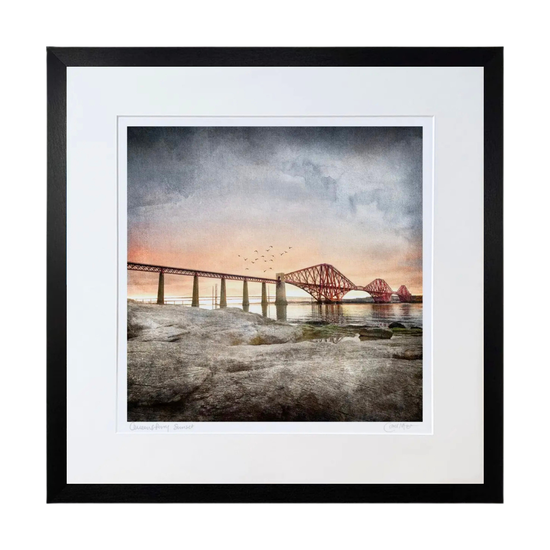 Queensferry Sunset is a captivating piece of artwork, born from a stunning photograph and expertly crafted by Scottish artist Carol McEwan. The original photograph has been transformed with skilled technique, revealing depth and detail upon closer inspection. Featuring an image of the iconic Forth Rail Bridge as the sun sets, this piece will add a touch of beauty and intrigue to any space. This beautiful giclée print has a cream mount and is framed with a simple black frame ready to hang. Signed by the artist.