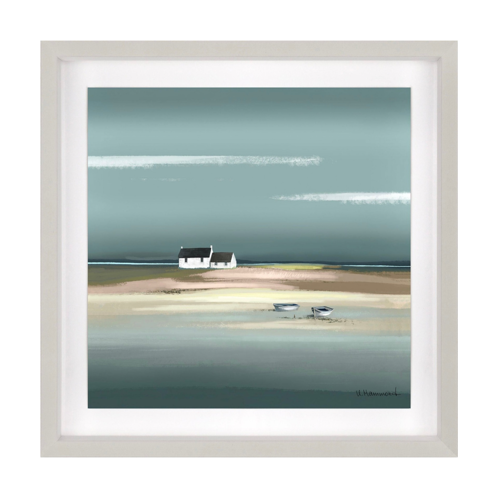 Immerse yourself in the tranquility of our serene sea view featuring a white cottage on the shore, surrounded by calm seas and has 2 little boats ready to take to the sea. The white mount and pale grey frame add to the calming and peaceful aesthetic, making it the perfect addition to any space. Escape to a peaceful paradise with this beautiful picture.